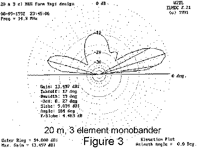 A three-element Yagi will outperform a dipole by 8 dB. That's what the books say, give or take a couple of dB. When I was new to ham radio, life was simple, gear was simple. I used government surplus radios, folded dipoles, and worked CW. Eventually, I graduated to a 100 watt SSB transceiver. I was still using dipoles. In the early sixties, linear amplifiers were dreamed-of accessories, not the necessity they are today. Most of my local friends used equipment similar to mine. A couple of nearby hams had beams. There was even a linear or two around, but there wouldn't be one at my house for several years. It was during those early years in ham radio, that I observed a very curious phenomena. It seemed as though stations using beams always got great signal reports and they could hear stations that were in the noise or QRM for me. I knew that a beam was supposed to have around 8 dB gain over my dipole, but it wasn't often that my signal reports were within an S-unit or two of the guys with the beams. In those days, there was simply something mysterious about those collections of aluminum that graced the tops of towers in other ham's back yards. I didn't know exactly what the difference was, but I did know that beams had a big advantage. This lead me to believe that one of two things was happening. Either signal reports were being inflated, or there was actually more than an 8 dB difference between dipoles and beams. Figures 1 through 4 give us one explanation for the difference in signal strength between my dipole and my neighbor's beam. First, let me tell you what these figures represent. Figures 1 and 2 are the azimuth and elevation patterns of a 20 meter dipole 50 feet in the air. Figures 3 and 4 represent a 3 element, 20 meter monobander also 50 feet high. The dimensions for the 3 element monobander were taken directly from the book Yagi Antenna Design by Dr. James L. Lawson, W2PV, page 7-2. This Yagi is based on NBS standards. I made no attempt to modify or optimize antenna dimensions, and as you can see, the front-to-back ratio is poor. For this article, it doesn't make any difference. That said, the beam is obviously designed for maximum gain and not maximum front-to-back ratio. The height of both antennas is .75l or about 50 feet, a common height for amateur radio antennas. Figure 3 shows that the beam's radiation pattern is concentrated at a low takeoff angle of 17·. This is an excellent takeoff angle for working DX. The dipole in figure 1 also has a low takeoff angle of 19·, but this lobe is very narrow. A much larger secondary lobe points straight up into the sky and a lot of energy is wasted warming the clouds. At all other directions, the difference between the dipole and beam would be between -6 dB and -20 dB, perhaps more. |