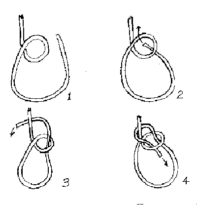 KNOTSThe knot of choice for nearly every antenna chore is the BOWLINE. This knot is easy to tie and it will not slip under any condition. With this knot, the more load you put on it, the tighter it gets. Use the Bowline to tie the support rope to each pulley, insulator, center-insulator, balun, etc. You can even tie two ropes together using the bowline. Here is an easy way to remember how to tie the Bowline: It's the way we teach it to new Boy Scouts. With the end of the rope in your right hand, make a overhand loop. Hold the loop in your left hand. Using the Boy Scout verbiage, "the rabbit (the end of the rope) comes out of his hole (the loop), goes around the tree (the long end of the rope) and then the rabbit goes back in his hole." If this sounds too complicated, just follow the diagram above. |