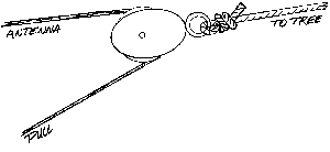 Usually, the 'antenna support rope' is smaller than the pulley support rope (the one in the tree). Done this way, as the antenna moves in the wind, the 'antenna support rope' moves through the pulley. The 'pulley support rope' is stationary in the tree, so abrasion is practically eliminated. As a secondary benefit, it is now easy to change antennas, and the chance of a support line getting tangled in the tree is reduced. To further protect against the wind breaking the lines, some installations use counter weights or springs at the ground end of the 'antenna support rope.' I have seen garage-door springs used to hold the loose end of the 'antenna support rope' to an eye-bolt screwed into a tree trunk. |